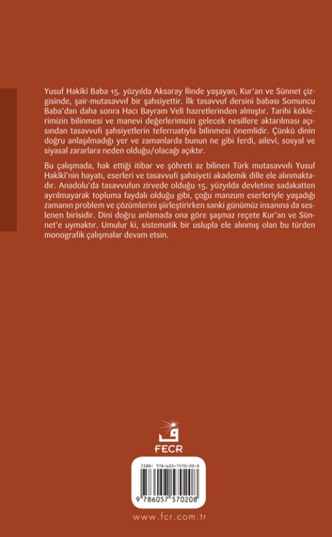 Bu çalışmada, hak ettiği itibar ve şöhreti az bilinen Türk mutasavvıfı Yusuf Hakîkî’nin hayatı, eserleri ve tasavvufi şahsiyeti akademik dille ele alınmaktadır. Anadolu’da tasavvufun zirvede olduğu 15. yüzyılda devletine sadakatten ayrılmayarak topluma faydalı olduğu gibi, çoğu manzum eserleriyle yaşadığı zamanın problem ve çözümlerini şiirleştirirken sanki günümüz insanına da seslenen birisidir. Dini doğru anlamada ona göre şaşmaz reçete Kur’an ve Sünnet’e uymaktır. Umulur ki, sistematik bir uslupla ele alınmış olan bu türden monografik çalışmalar devam etsin.