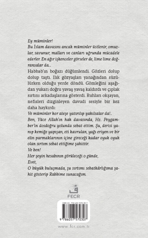 Habbab’ın boğazı düğümlendi. Gözleri dolup dolup taştı. Ilık gözyaşları yanağından süzülürken olduğu yerde döndü. Gömleğini aşağıdan yukarı doğru yavaş yavaş kaldırdı ve çıplak sırtını arkadaşlarına gösterdi. Ruhları okşayan, nefisleri dizginleyen davudi sesiyle bir kez daha haykırdı: