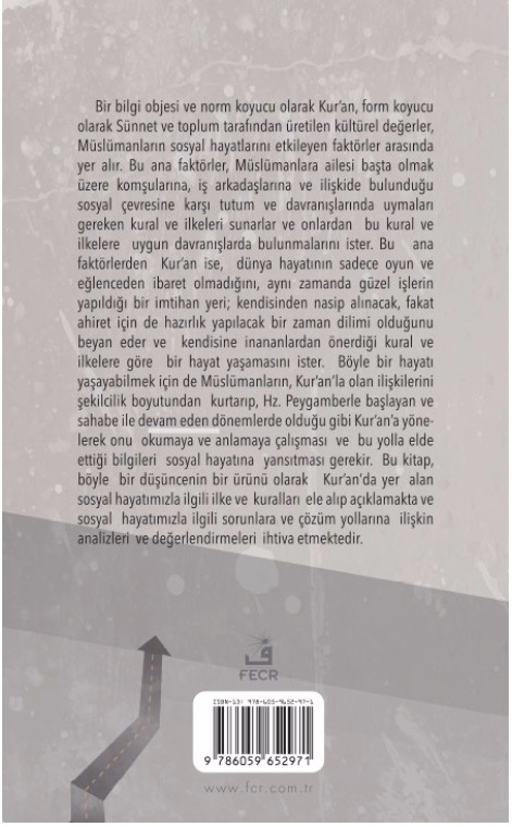 Bir bilgi objesi ve norm koyucu olarak Kur’an, form koyucu olarak Sünnet ve toplum tarafından üretilen kültürel değerler, Müslümanların sosyal hayatlarını etkileyen faktörler arasında yer alır. Bu ana faktörler, Müslümanlara ailesi başta olmak üzere komşularına, iş arkadaşlarına ve ilişkide bulunduğu sosyal çevresine karşı tutum ve davranışlarında uymaları gereken kural ve ilkeleri sunarlar ve onlardan bu kural ve ilkelere uygun davranışlarda bulunmalarını ister. Bu ana faktörlerden Kur’an ise, dünya hayatının sadece oyun ve eğlenceden ibaret olmadığını, aynı zamanda güzel işlerin yapıldığı bir imtihan yeri; kendisinden nasip alınacak, fakat ahiret için de hazırlık yapılacak bir zaman dilimi olduğunu beyan eder ve kendisine inananlardan önerdiği kural ve ilkelere göre bir hayat yaşamasını ister. Böyle bir hayatı yaşayabilmek için de Müslümanların, Kur’an’la olan ilişkilerini şekilcilik boyutundan kurtarıp, Hz. Peygamberle başlayan ve sahabe ile devam eden dönemlerde olduğu gibi Kur’an’a yönelerek onu okumaya ve anlamaya çalışması ve bu yolla elde ettiği bilgileri sosyal hayatına yansıtması gerekir. Bu kitap, böyle bir düşüncenin bir ürünü olarak Kur’an’da yer alan sosyal hayatımızla ilgili ilke ve kuralları ele alıp açıklamakta ve sosyal hayatımızla ilgili sorunlara ve çözüm yollarına ilişkin analizleri ve değerlendirmeleri ihtiva etmektedir.